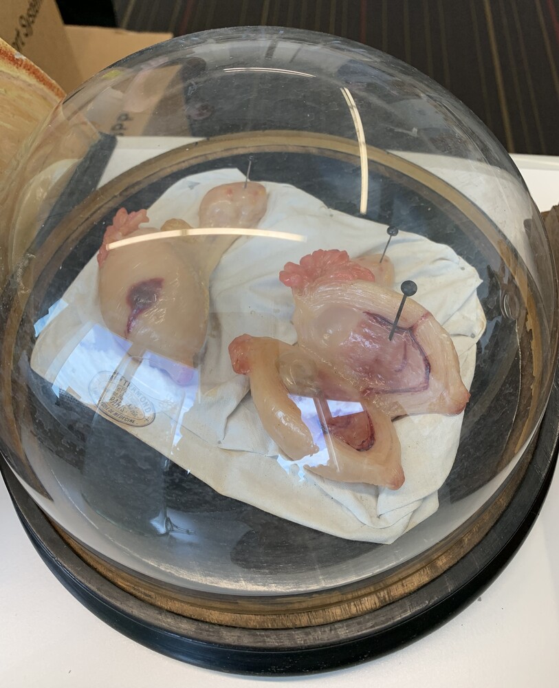 BeskrivningUtomkvedshavandeskapWax model of ectopic pregnancy. In contemporary wood and glass domed case.