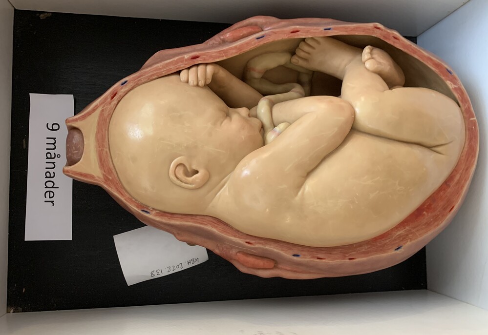 BeskrivningAnatomisk modell av foster i plast/vax på svart platta 9 månaderAnatomical model of fetus in plastic/wax on a black board 9 months