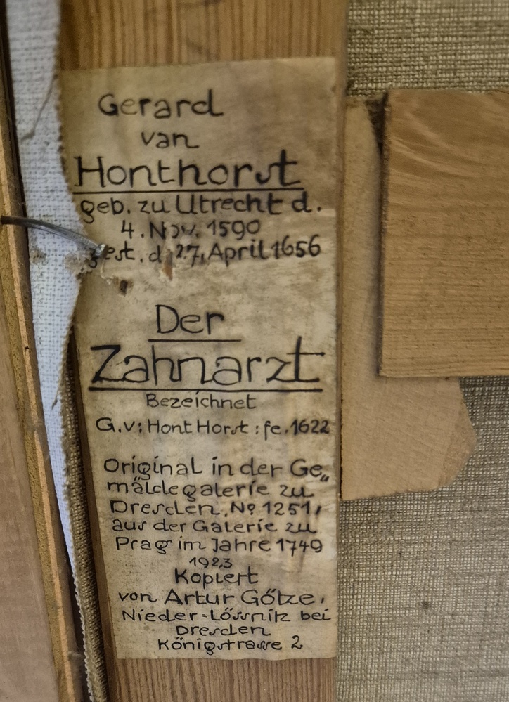 BeskrivningReproduction (copy) of 'Der Zahnarzt' originally by Gerrit (Gerard) van Honthorst, 1622.