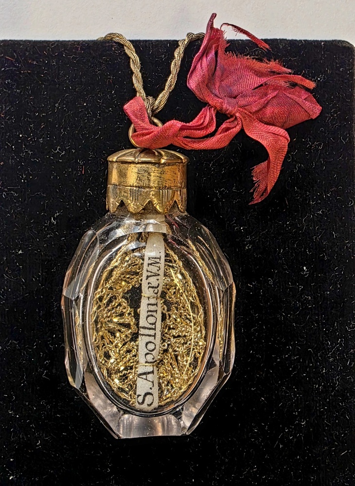 BeskrivningFlacon av slipat böhmisktglas med brännförgyld bronskapsel / dekor av medeltida typ /. Innehåller ett filetarbete av guld jämte en pergamentsenisa sign .: "S. Appolonia. V. M". På dess verso sida är relicken fästad, troligen inbäddad i vax ( 3 x 3 mm) Amulett mot tandvärk och dent. liff. inf. - det röda sidenbandet kan möjt tyda på dess användning även mot blöd ningar. Sydtyskland - senare hälften av 1700 talet